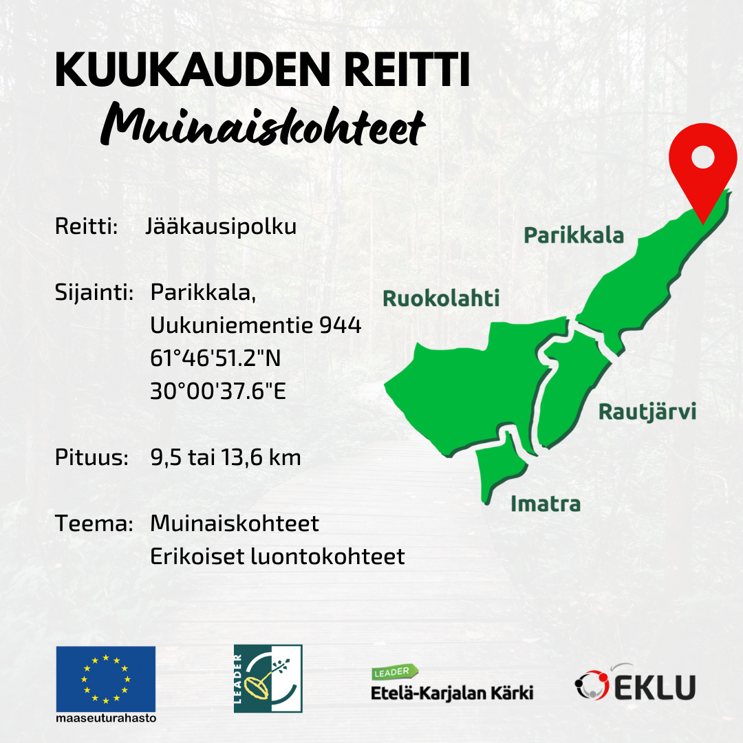 Kuvaus reitistä: Ruokolahdelta, Saimaan rannalta, löytyy esi-isien taidetta kallioseinämästä lyhyen metsäkävelymatkan päästä. Maalauksen punamultaväri on säilynyt erittäin hyvänä ja voimakkaan värisenä. Kalliomaalaus on tehty 4 700-3 700 vuotta sitten Suursaimaa -vaiheen jälkeisenä aikana. Kohteen parkkipaikalla on Saimaa Geoparkin opaste. Toinen opaste löytyy rannasta, kalliomaalauksen läheltä.