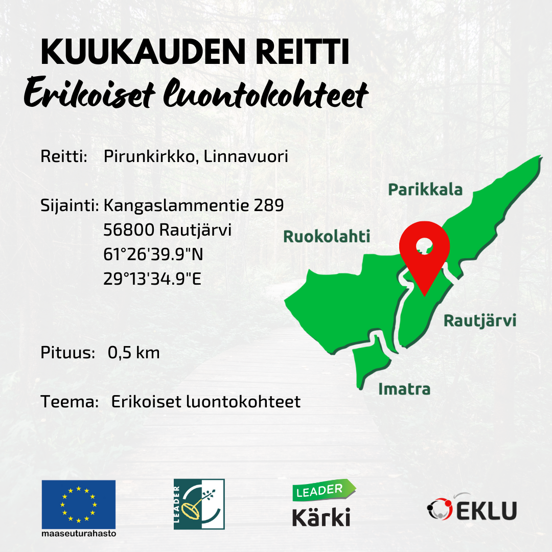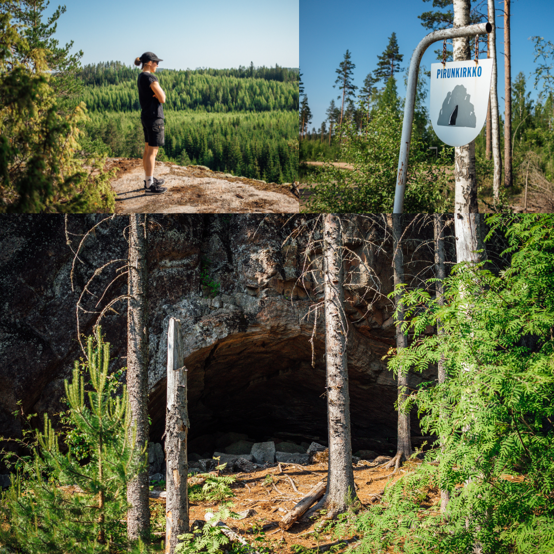 Kuvaus reitistä: Pirunkirkko on kivikorkea luola, joka on saanut nimensä sen holvimaisesta katosta. Ihmiset uskoivat ennen vanhaan, että itse piru rakensi luolan kirkokseen, jotta ihmisillä olisi paikka jossa palvoa häntä.