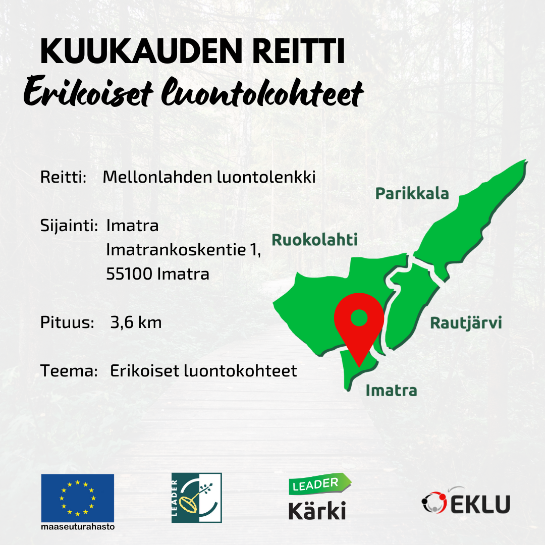 Kuvaus reitistä: Mellonlahti Imatrankosken alapuolella on keidas kaupungin keskustan läheisyydessä. Luontolenkillä pääset Imatrankosken ja Vuoksen luontoon aivan kaupungin keskustassa. Mellonlahti on eristetty Vuoksesta penkereellä, ja se muodostaa aivan oman eliöyhteisönsä, kun Vuoksen vesi ei virtaa sen kautta.