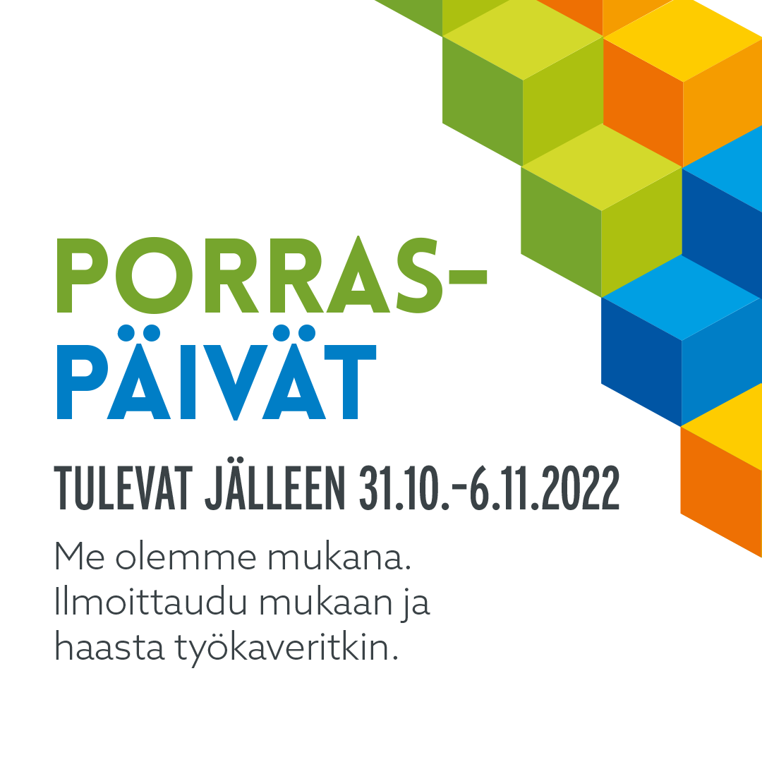 Lisätietoa kampanjasta löydät osoitteesta www.porraspaivat.fi. Sieltä näet myös kaikki työyhteisöt ympäri Suomen, jotka ovat mukana vuoden 2022 valtakunnallisissa Porraspäivissä.