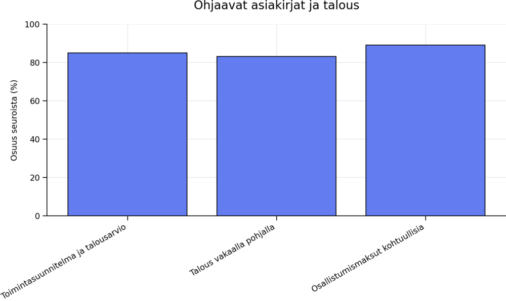 Toimintaa ohjaavat keskeiset asiakirjat ovat laajasti käytössä. 85 prosenttia seuroista kertoo toimintasuunnitelman ja talousarvion ohjaavan toimintaa. Taloutensa kokee vakaaksi ja vastuullisesti hoidetuksi 83 prosenttia seuroista, ja 89 prosenttia pitää osallistumismaksuja kohtuullisina.