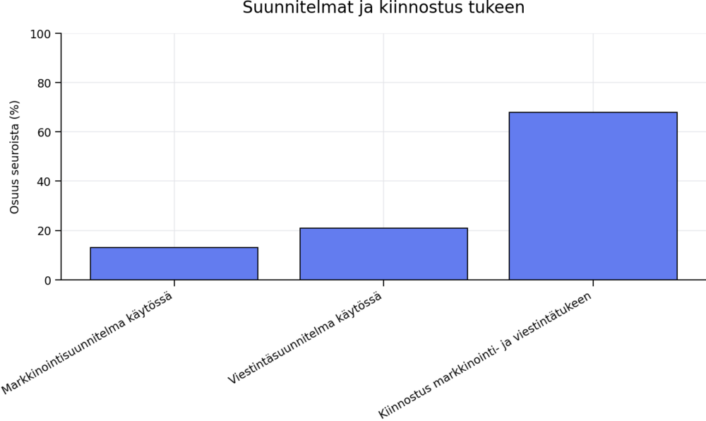 Suurimmat kehittämistarpeet liittyvät viestintään ja markkinointiin. Markkinointisuunnitelma on käytössä vain 13 prosentilla vastanneista seuroista ja viestintäsuunnitelma 21 prosentilla. Tästä huolimatta 68 prosenttia seuroista on vähintään kiinnostuneita saamaan tukea markkinointi- ja viestintäsuunnitelmien tekemiseen.