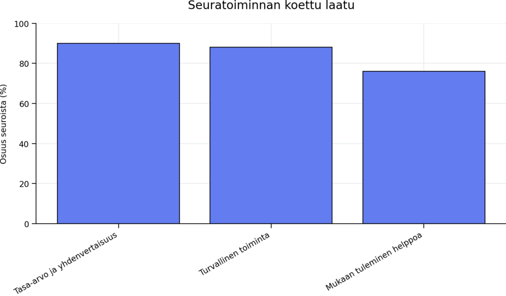 Valtaosa seuroista arvioi toimintansa kokonaisuutena myönteiseksi. Tasa-arvon ja yhdenvertaisuuden koetaan toteutuvan hyvin: 90 prosenttia seuroista arvioi toimintansa olevan näiltä osin kunnossa. Turvalliseksi toimintansa kokee 88 prosenttia seuroista, ja 76 prosenttia katsoo seuratoimintaan mukaan tulemisen olevan helppoa.