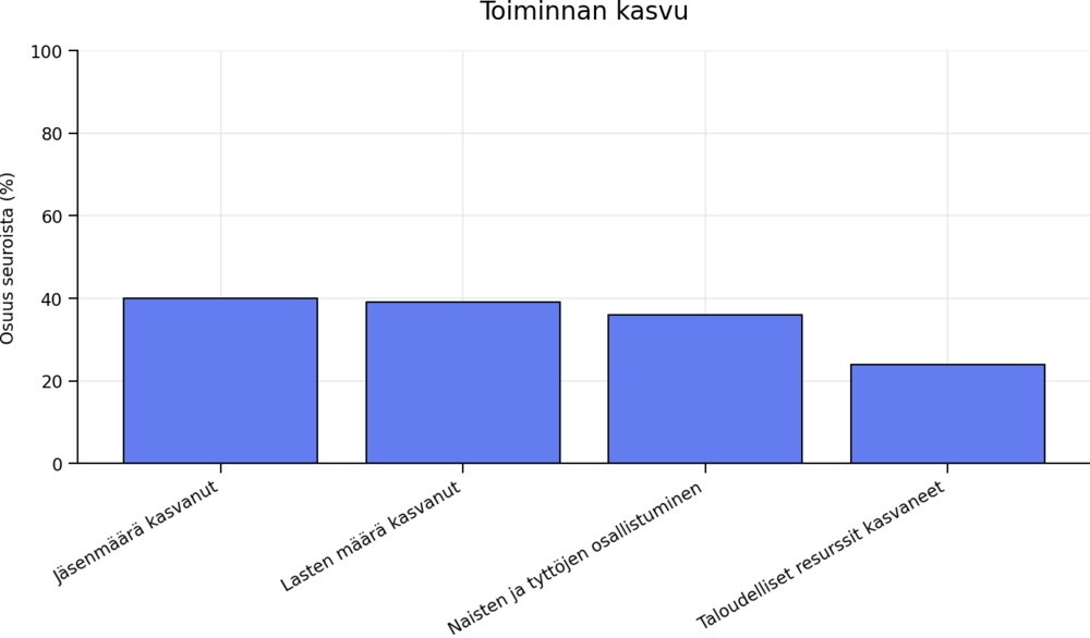 Useilla osa-alueilla seurat raportoivat maltillista kasvua. Jäsenmäärän koki kasvaneen 40 prosenttia seuroista, lasten määrän 39 prosenttia ja naisten ja tyttöjen osallistumisen 36 prosenttia.