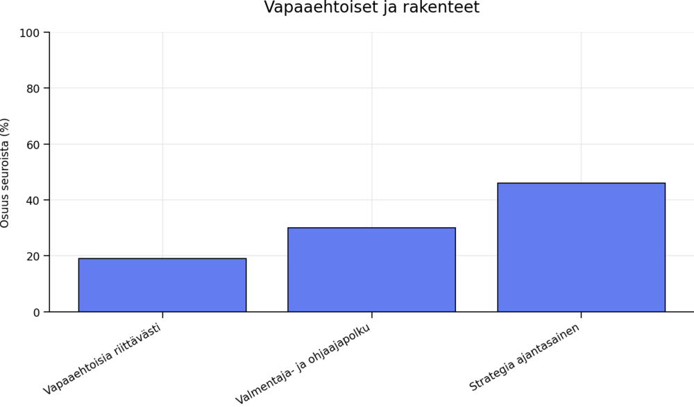 Vapaaehtoisten riittävyys on merkittävä haaste: vain 19 prosenttia seuroista kokee vapaaehtoisresurssien olevan riittävät. Valmentaja- ja ohjaajapolku on tunnistettu tai käytössä 30 prosentilla seuroista.